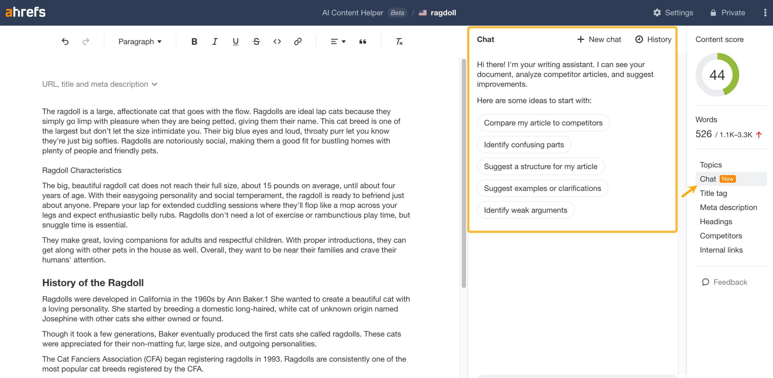 Improve your content for both humans and search engines – just open a chat and ask AI to identify weak points in your content, brainstorm ideas, refine your article structure, and more.