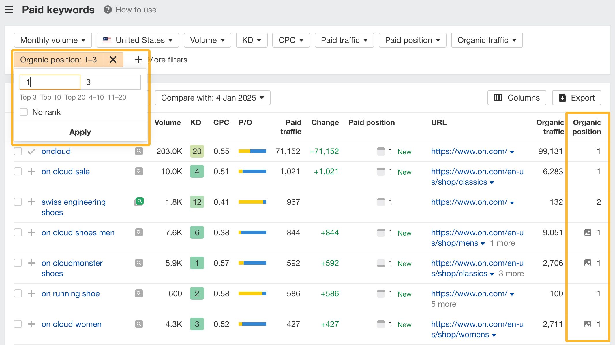 Use the organic positions filter or column to find out if you’re running ads on keywords your website already ranks for organically. This helps you detect if you’re cannibalizing your own rankings and wasting advertising budget.