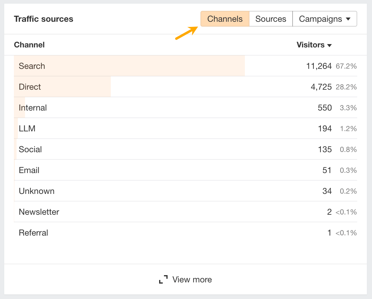 See which channels are bringing you the most traffic: Search, Direct, LLM, Email, Newsletter, and so on.