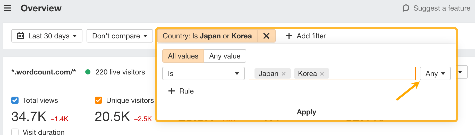 Select Continents in the Geography widget to compare traffic between North America vs Europe, for example.
