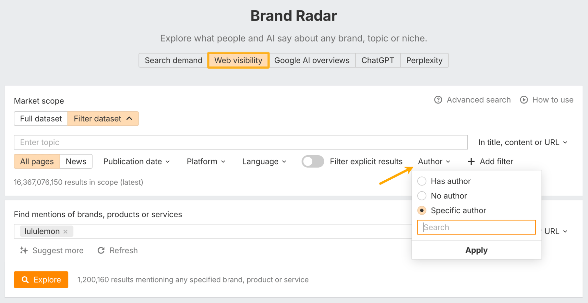 Filter for pages with or without a detected author in Web visibility – or just search for specific names.