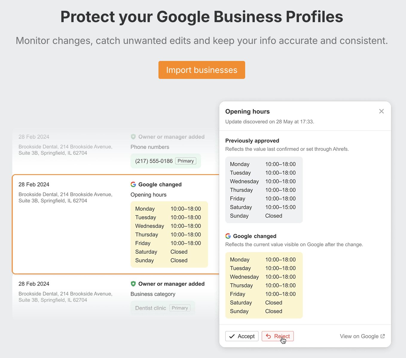 Accept or reject edits with a click – just connect your Google account and import locations to get started.