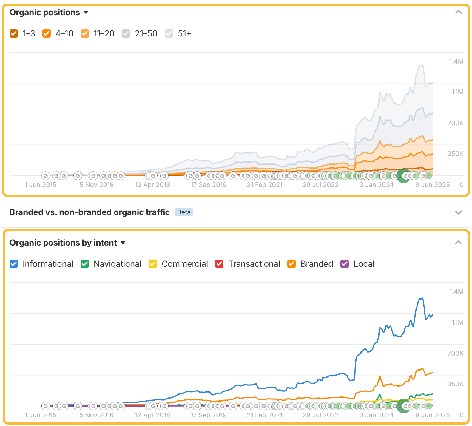 Organic keywords and Intent charts now count every ranking position, not just unique keywords. So if you rank in multiple spots or locations, each one counts. This update means more accurate totals, faster loading, and better support for large sites.