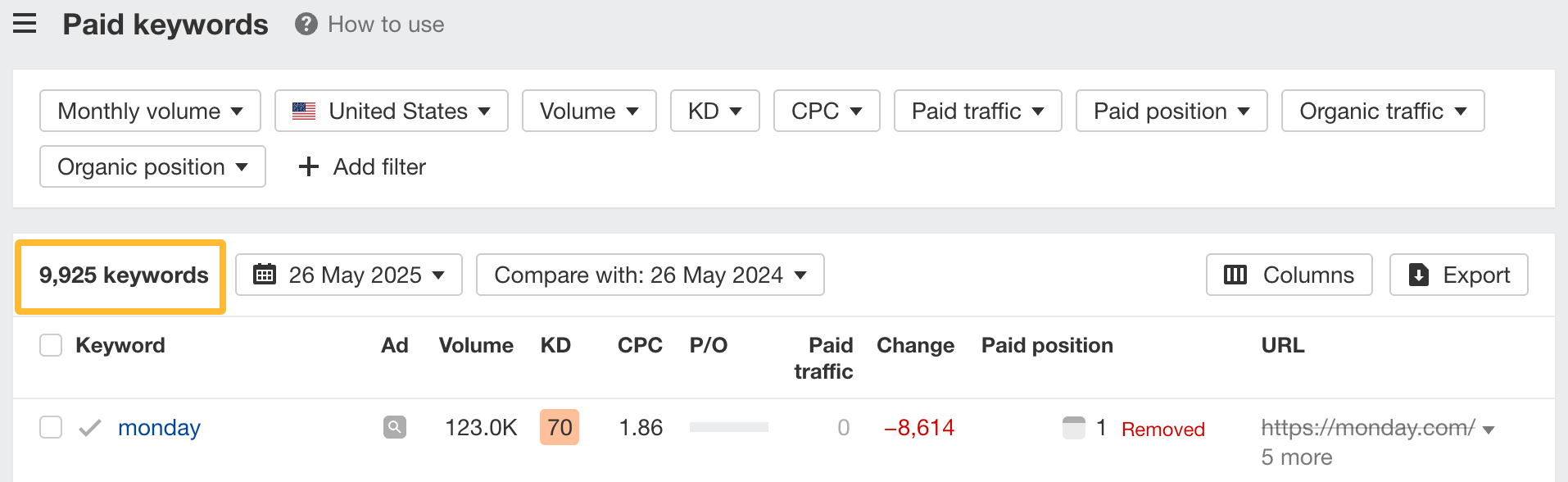 Here’s a real example: for monday.com in the US, the old report found around 9.9k paid keywords.