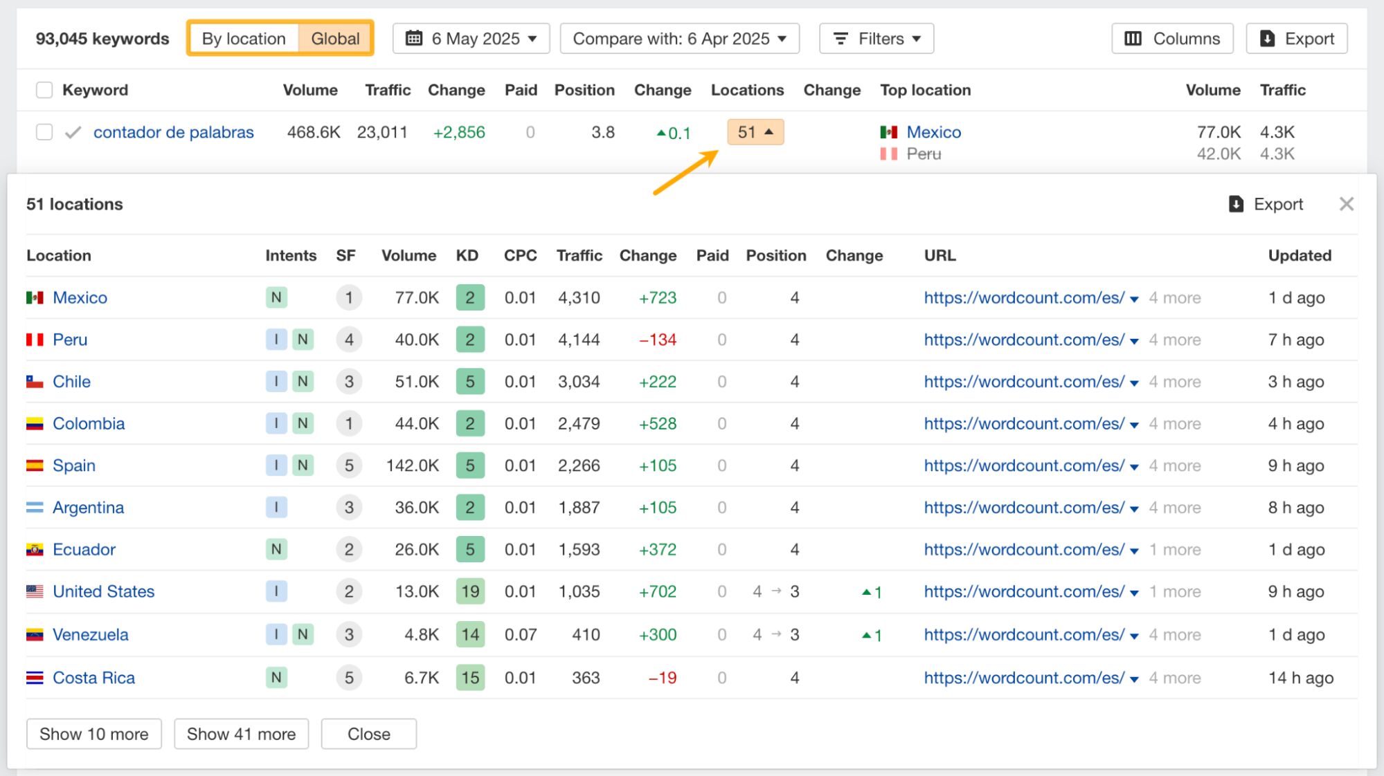 Toggle Global on to see global search volumes and traffic for every keyword, along with a list of all countries where your site ranks. It’s an easy way to get the full picture of your brand’s search demand worldwide – without having to jump between multiple location reports.