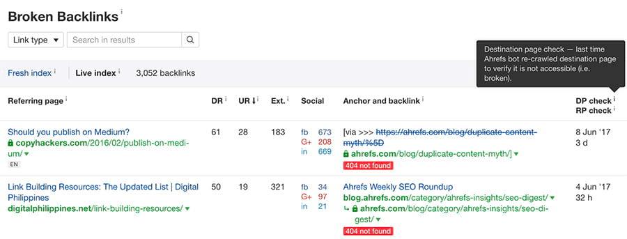- Destination page check — last time Ahrefs bot re-crawled destination page to verify it is not accessible (i.e. broken).