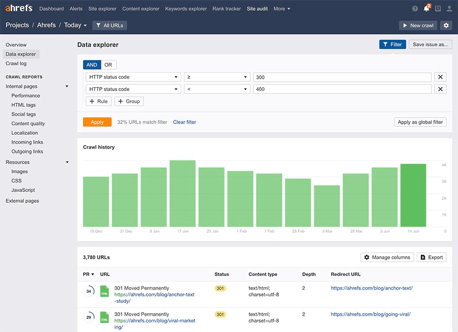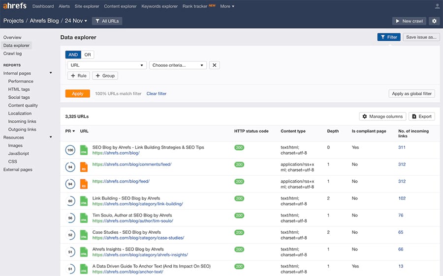 This is the heart and soul of Ahrefs’ Site Audit tool. We give you all the raw data that we have crawled, so that you can slice and dice it in any way you want (and export to CSV, if needed).