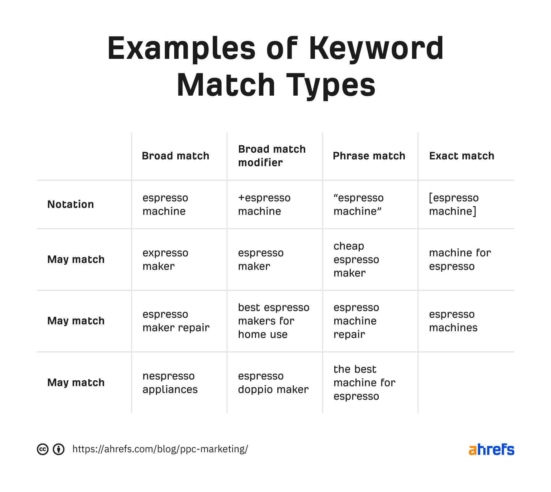 For example, if we take the keyword “espresso machine,” here’s how the keyword match types might make it work (you can never know with 100% certainty):