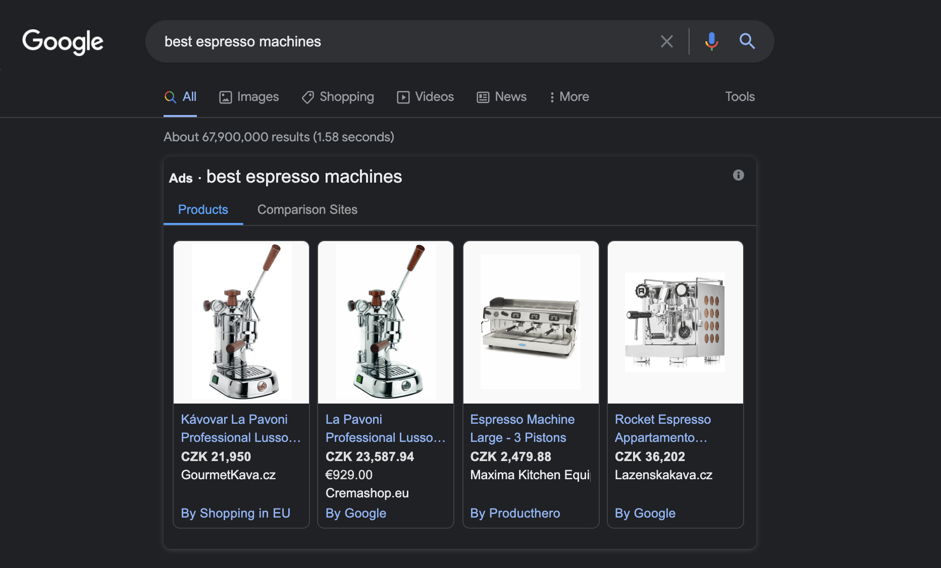 The closer you are to the buying decision, the more search ads will appear in your SERPs. You’re likely not ready to buy a coffee maker when you start searching for what makes a good one. But that changes once you start looking up keywords like “best espresso machines under $1000,” “Jura WE6 piano review,” or “buy Gaggia Classic Pro.”