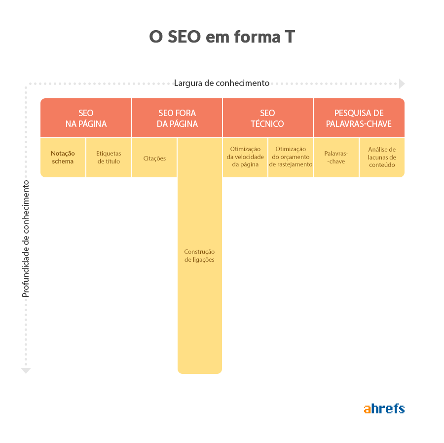 Então, quando souber do que mais gosta, está na hora de começar a expandir o seu conhecimento nessa área. Faça isto e tornar-se‑á logo o que o Rand Fishkin chama de um profissional de marketing em forma de T. Pode então começar a criar um nicho para os seus serviços.