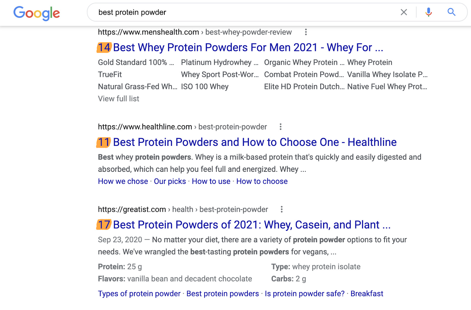 Olhe para as páginas atuais mais bem posicionadas para a sua palavra-chave alvo no Google e verifique se há um ângulo dominante. Pode ver que os três principais artigos sobre a “melhor proteína em pó” são todos listicles.
