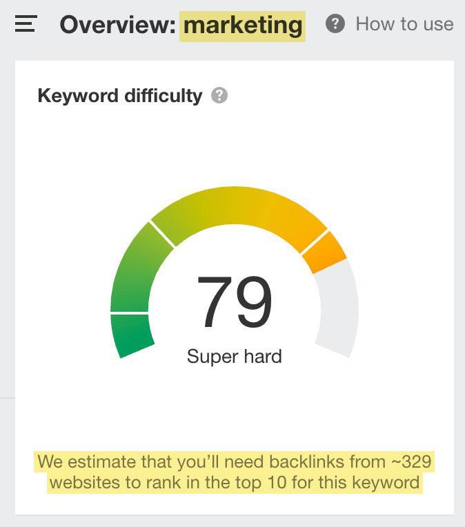 Como pode ver através da captura de ecrã cima, a palavra-chave “marketing” tem uma dificuldade de 79, o que é já considerada ser “muito difícil”.