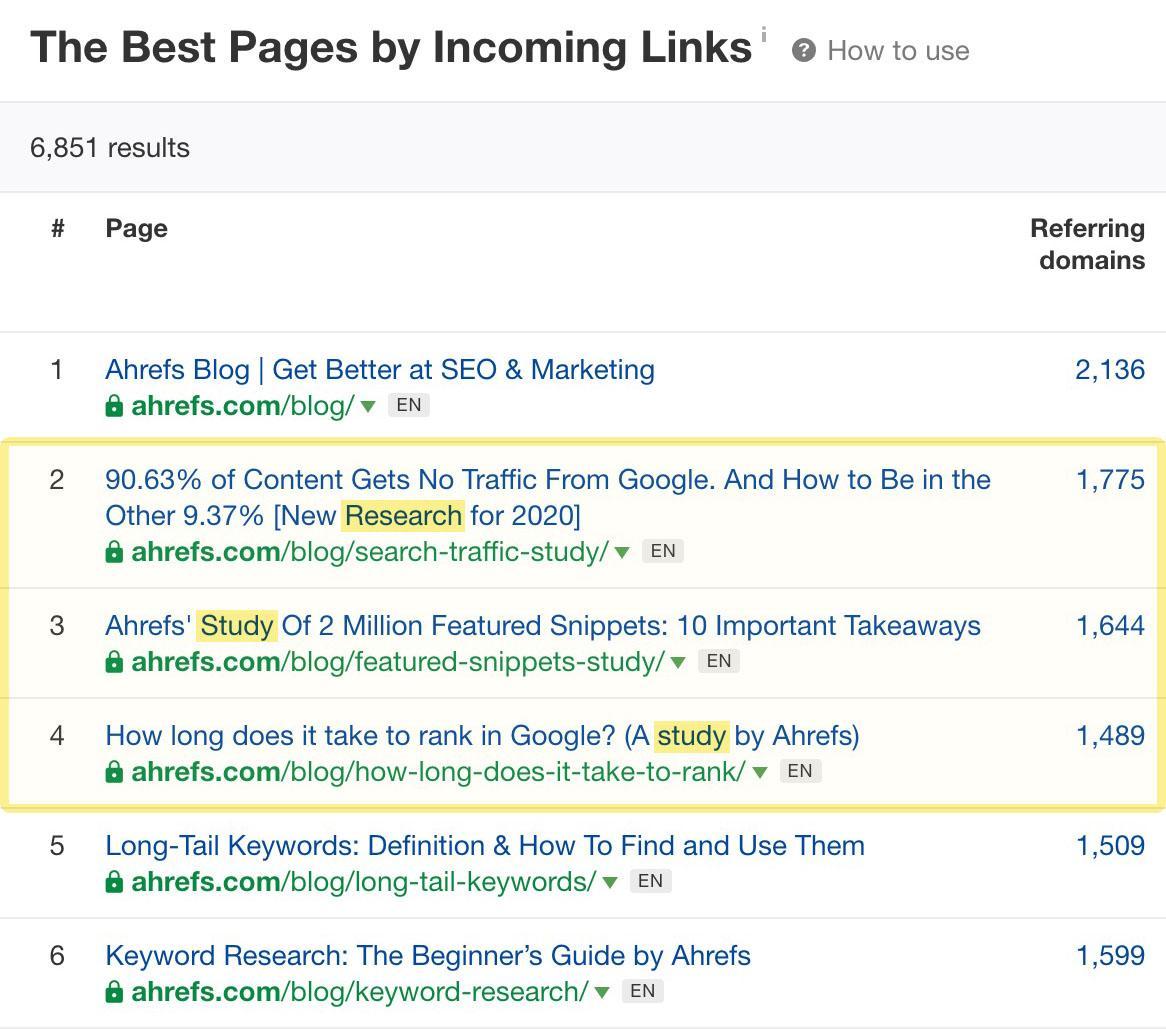 Como pode constatar, 3 dos 5 artigos do blog da Ahrefs mais referenciados na web (excluindo a página principal do próprio blog) são estudos de pesquisa de dados analíticos. Isto sugere que estes estudos são os que mais atraem e promovem a criação de backlinks por pessoas relacionadas com a indústria do marketing digital e SEO.