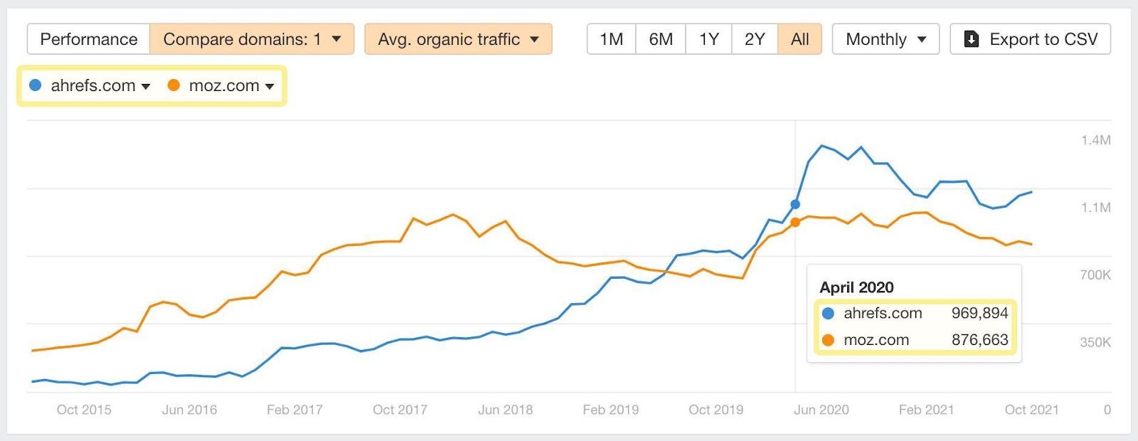 Como pode ver na captura de ecrã acima, o nosso website (ahrefs.com) tem mais de 1 milhão de visitas por mês através de pesquisas no Google. Em 2019, nós ultrapassamos um dos nossos maiores concorrentes (moz.com) em termos de volume de tráfego orgânico.