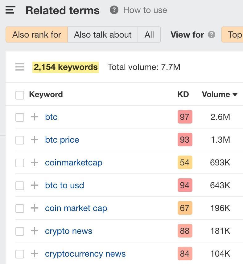 Você também pode querer ver o relatório de termos relacionados no Explorador de Palavras-chave, que mostra palavras-chave de alguma forma relevantes para a palavra “bitcoin”, mas não necessariamente contêm essa palavra nelas mesmas: