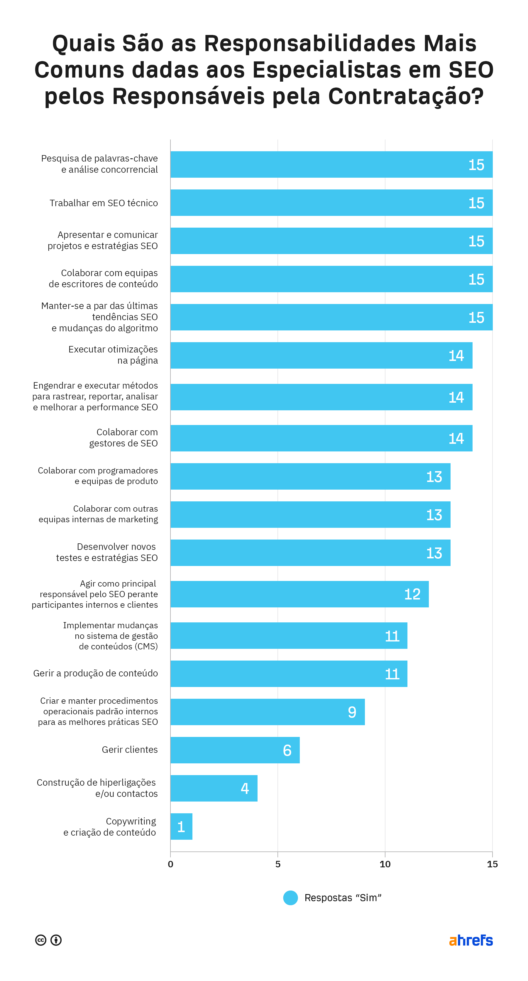 Nesta seção, apresentámos aos gestores de contratação de SEO 19 das responsabilidades mais comuns das descrições de cargo de especialista em SEO. De seguida, perguntámos se cada uma delas seria ou não uma responsabilidade diária para o seu ‘especialista em SEO’.