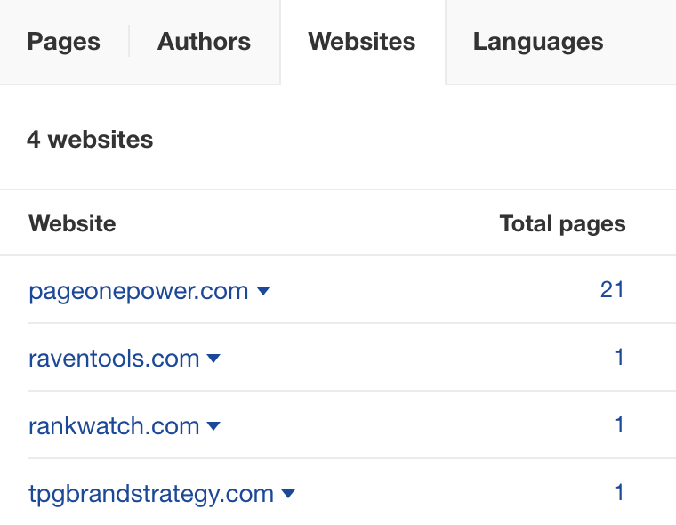 Visto que ele publicou a maioria do conteúdo em pageonepower.com, é quase certamente o seu website pessoal. Portanto, vamos clicar no número na coluna “Total de páginas” para ver os artigos que ele tem escrito lá.