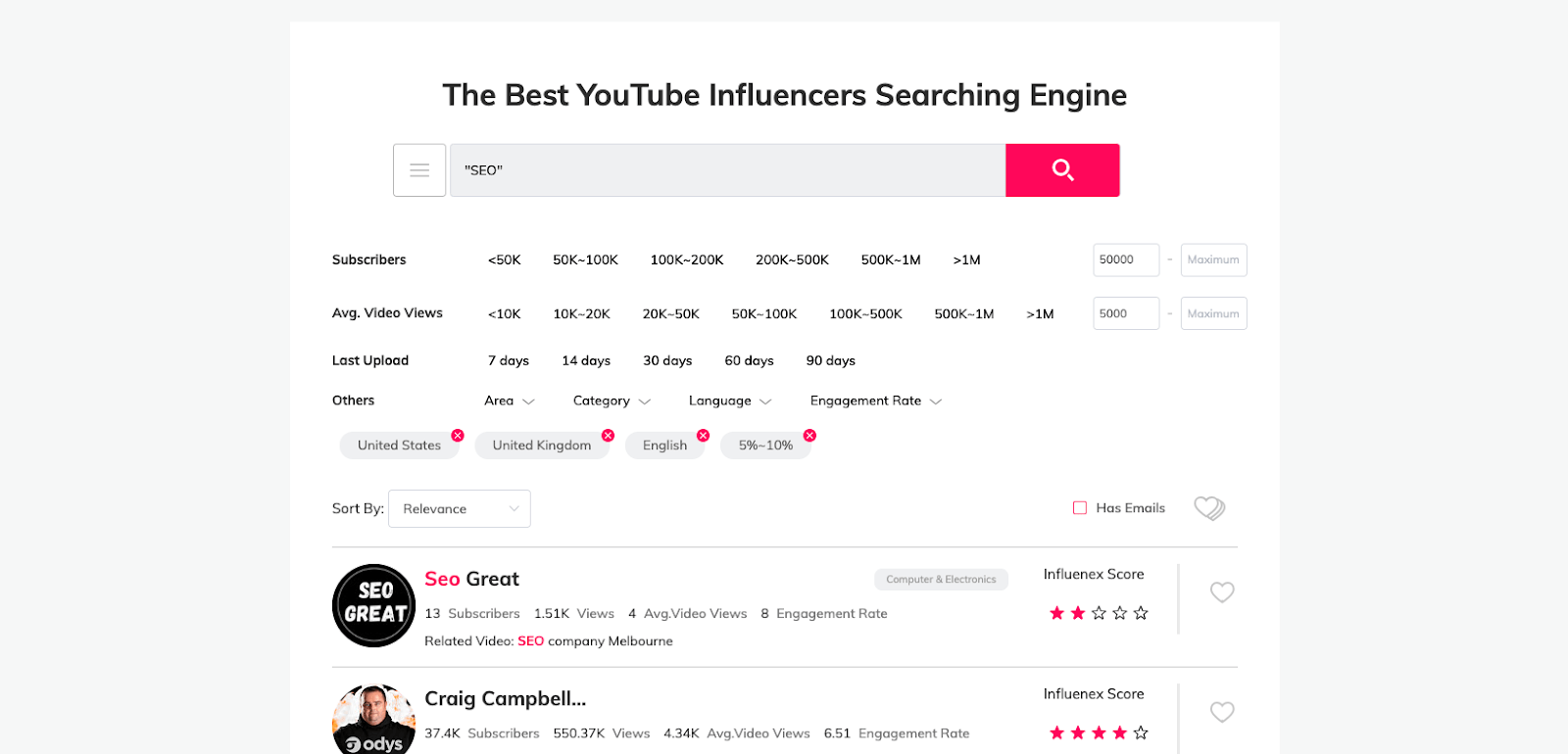 Se está à procura de influenciadores de vídeo, Influenex anexa canais do YouTube e vídeos com contagem de subscritores, visualizações em média por vídeo, taxas de interação, duração do vídeo e a data do último carregamento. Eles também têm um proprietário “Influenex Score” para dar-lhe uma leitura rápida sobre o potencial ROI de contratar um influenciador.