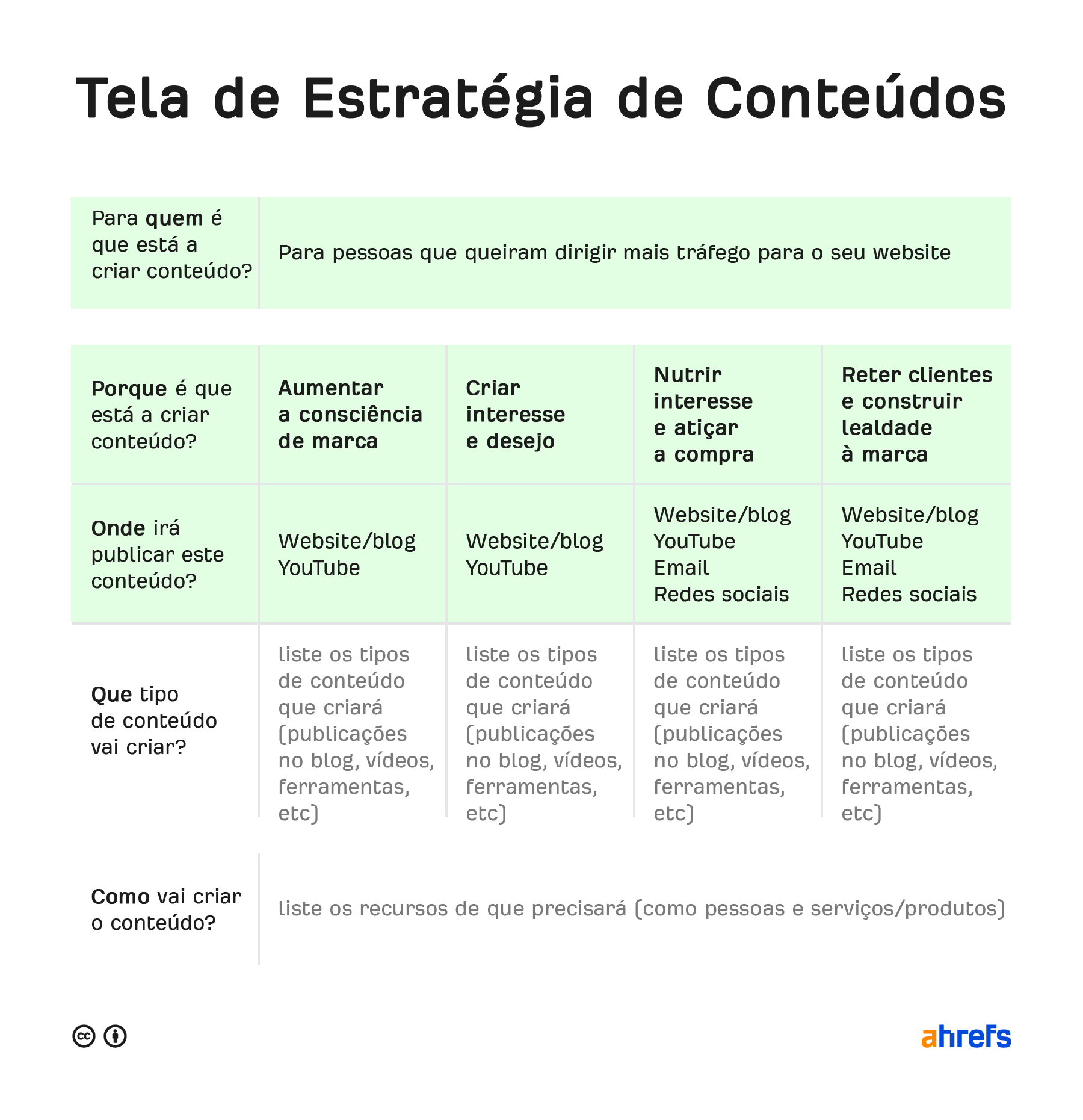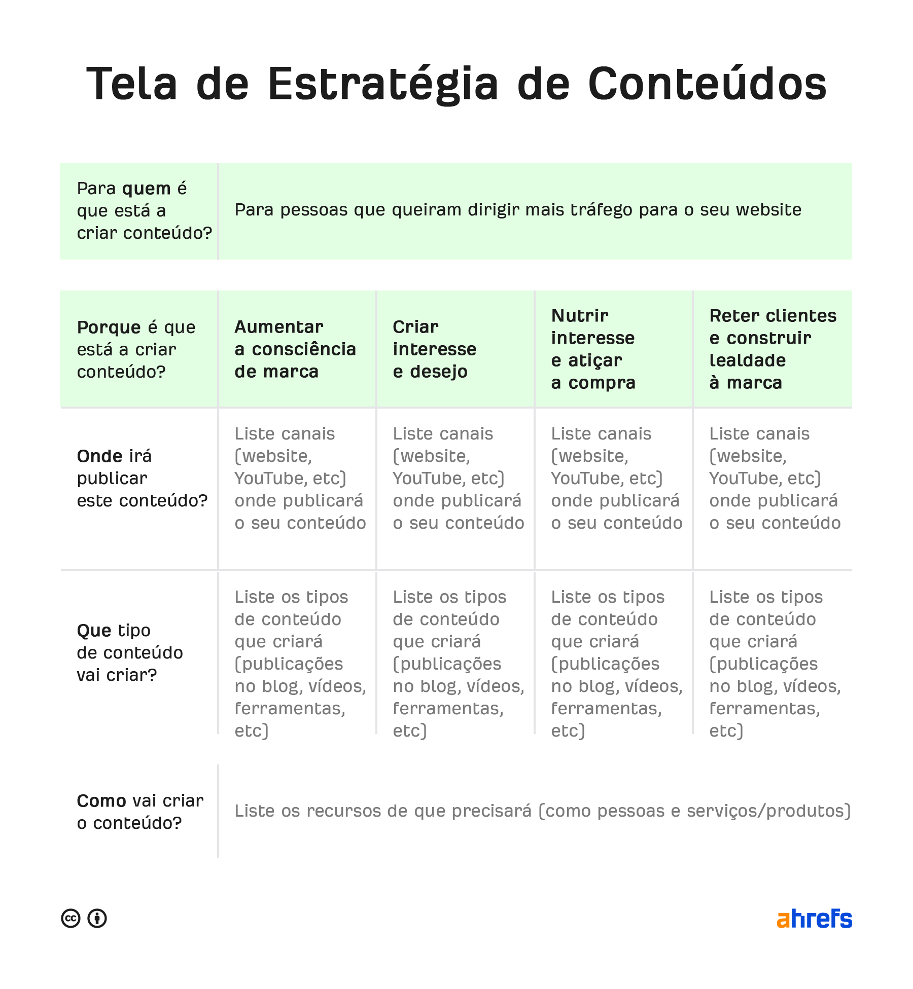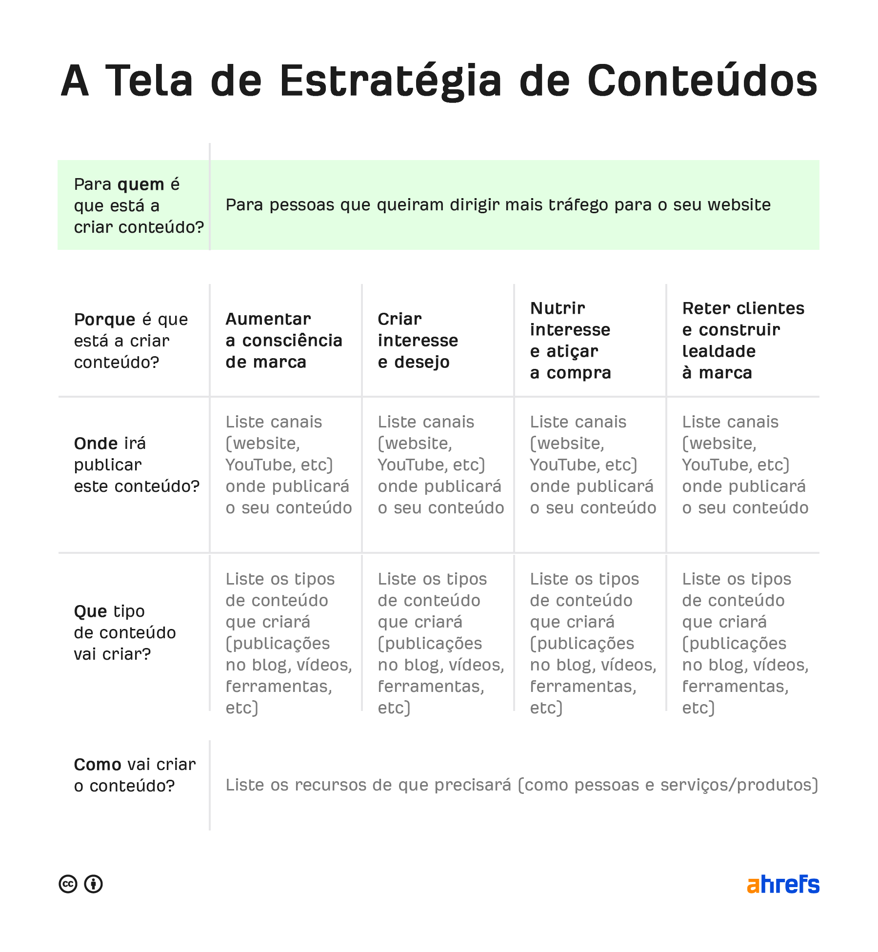 Criar uma estratégia de conteúdo pode ser um processo bastante difícil, então criámos uma estrutura simples para tornar as coisas mais fáceis, uma tela de estratégia de conteúdo:
