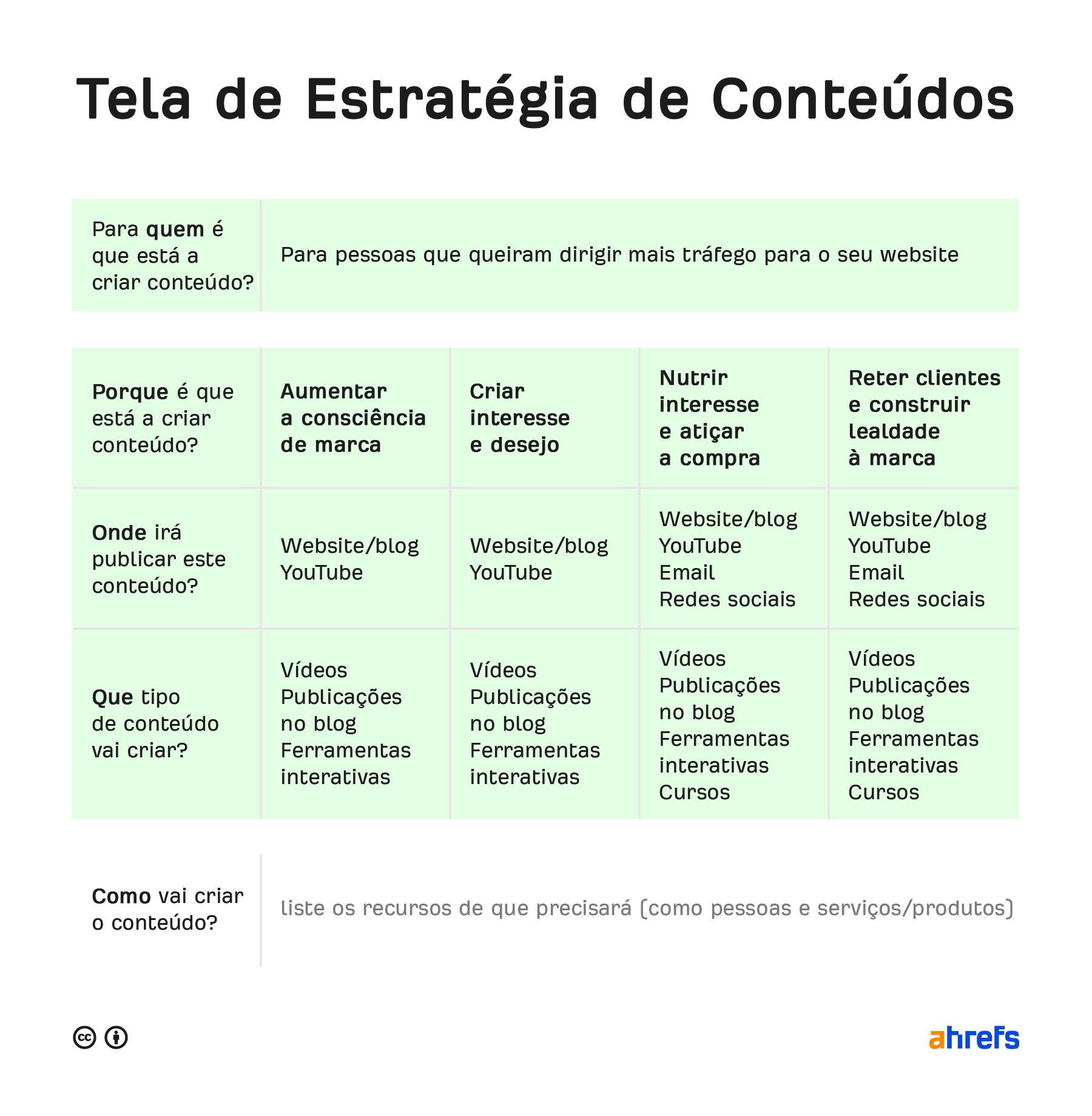 De qualquer forma, verá que esses “porquês” são preenchidos previamente no quadro de estratégia de conteúdo porque precisa de criar conteúdo para todos os fins. Afinal, não adianta ter uma marca conhecida se nunca ninguém lhe compra nada, e não adianta trabalhar para atrair clientes se não os puder conservar.