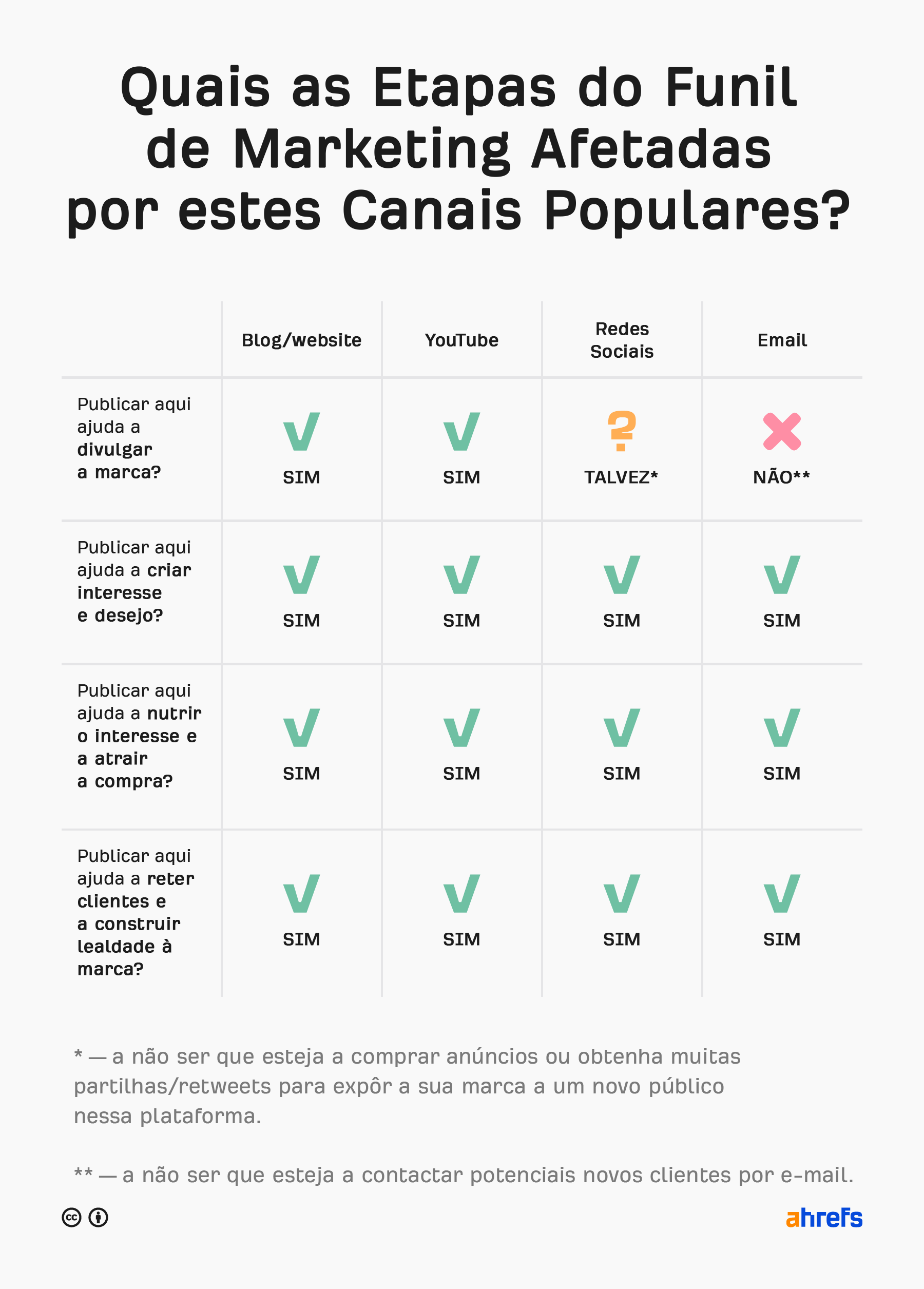 Por exemplo, publicar um boletim informativo por e‑mail não adianta de nada para construir a noção da marca, porque quem não conhece a sua marca não se inscreve. Da mesma maneira, fazer podcasts dificilmente ajudará a reter clientes e a construir fidelidade à marca.