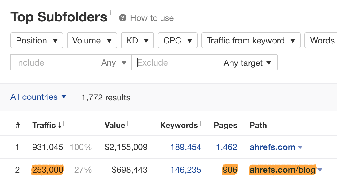 Neste momento, temos 906 publicações de blog, e o nosso blog recebe cerca de 253 mil visitas de pesquisa todos os meses — de acordo com o relatório Principais subpastas no Explorador de Websites da Ahrefs.