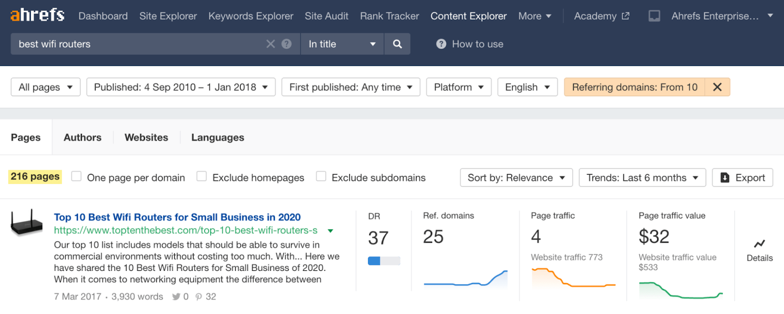 Content Explorer é uma base de dados pesquisável com mais de nove bilhões de páginas. É fantástica para pesquisa de conteúdo, mas também como fonte de prospeção de links.