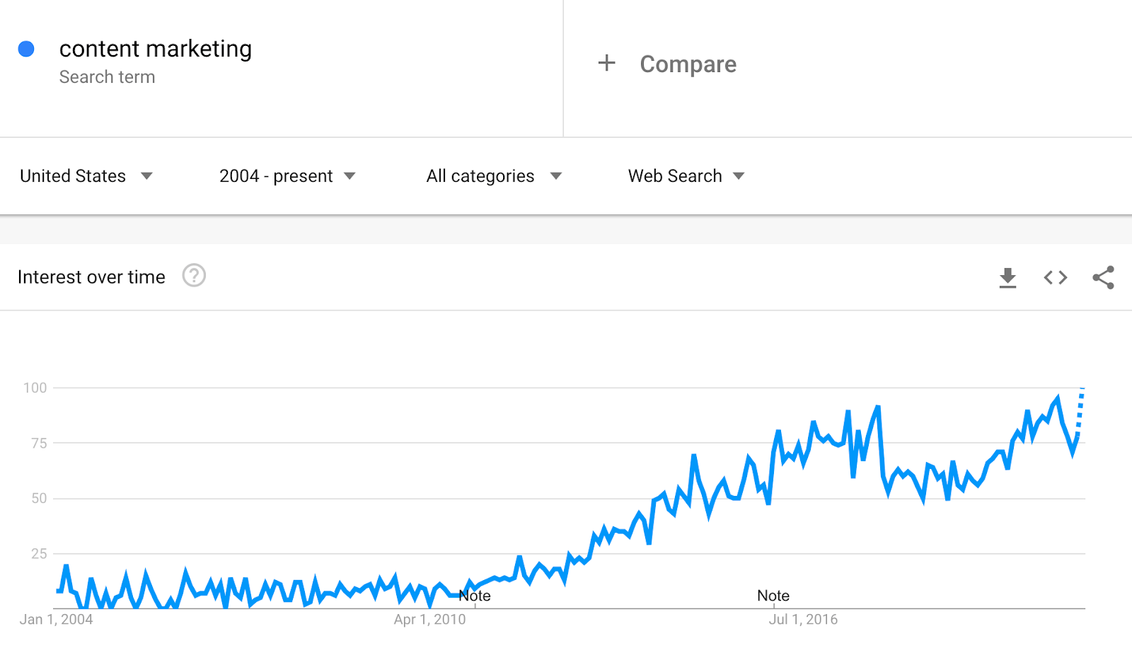 O marketing de conteúdo hoje está na moda. Veja o aumento astronómico de interesse ao longo do tempo: