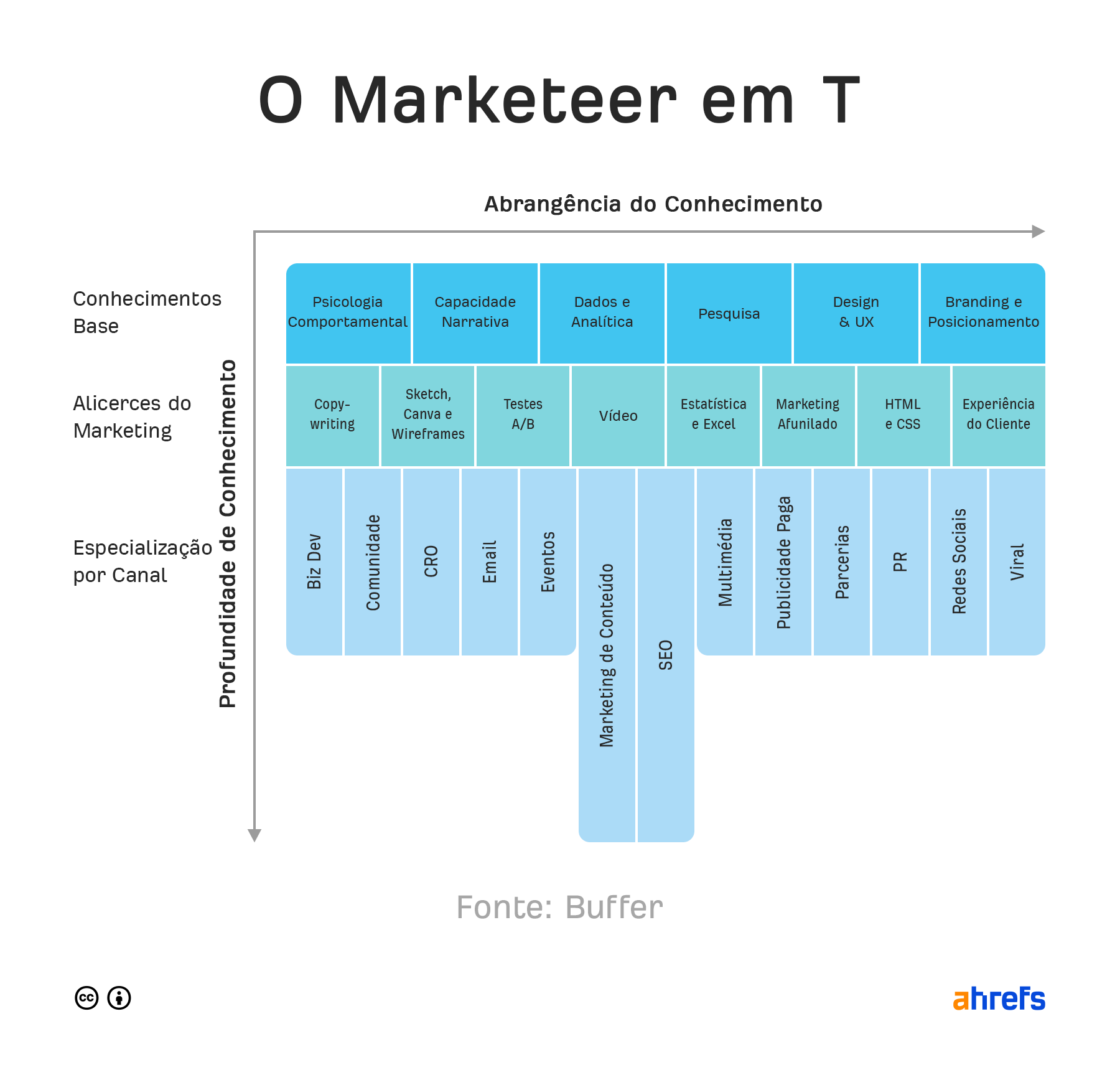Se deseja exercer uma função de gestão, considere ser um profissional de marketing em forma de “T”. Isso significa que tem amplas habilidades/conhecimentos em todas as coisas relacionadas com marketing, mas se destaca numa área específica.