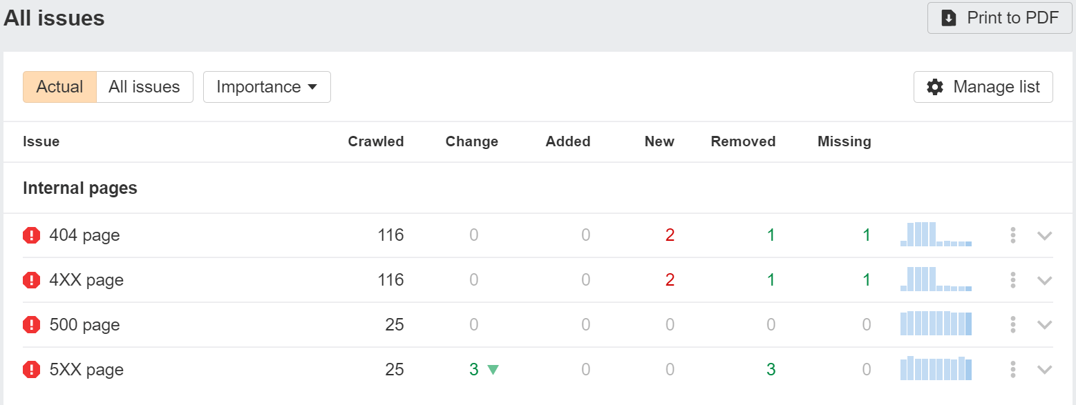 Erros 5xx atrasam inevitavelmente o rastreamento. Eventualmente, as páginas serão retiradas do índice do Google devido a este motivo. Você pode encontrar estes erros através da ferramenta Site Audit ou nas ferramentas para Webmasters da Ahrefs. Ainda assim, note que eles podem ser diferentes dos 5xxs que o Google vê do outro lado. Como esses são erros do servidor, nem sempre estão presentes ou são detetáveis com rigor.