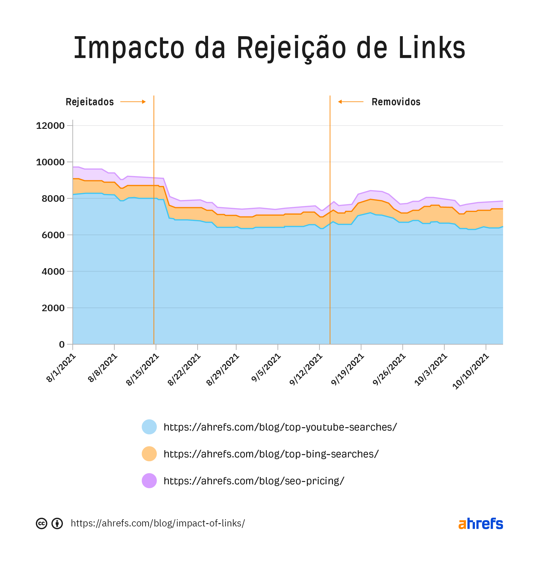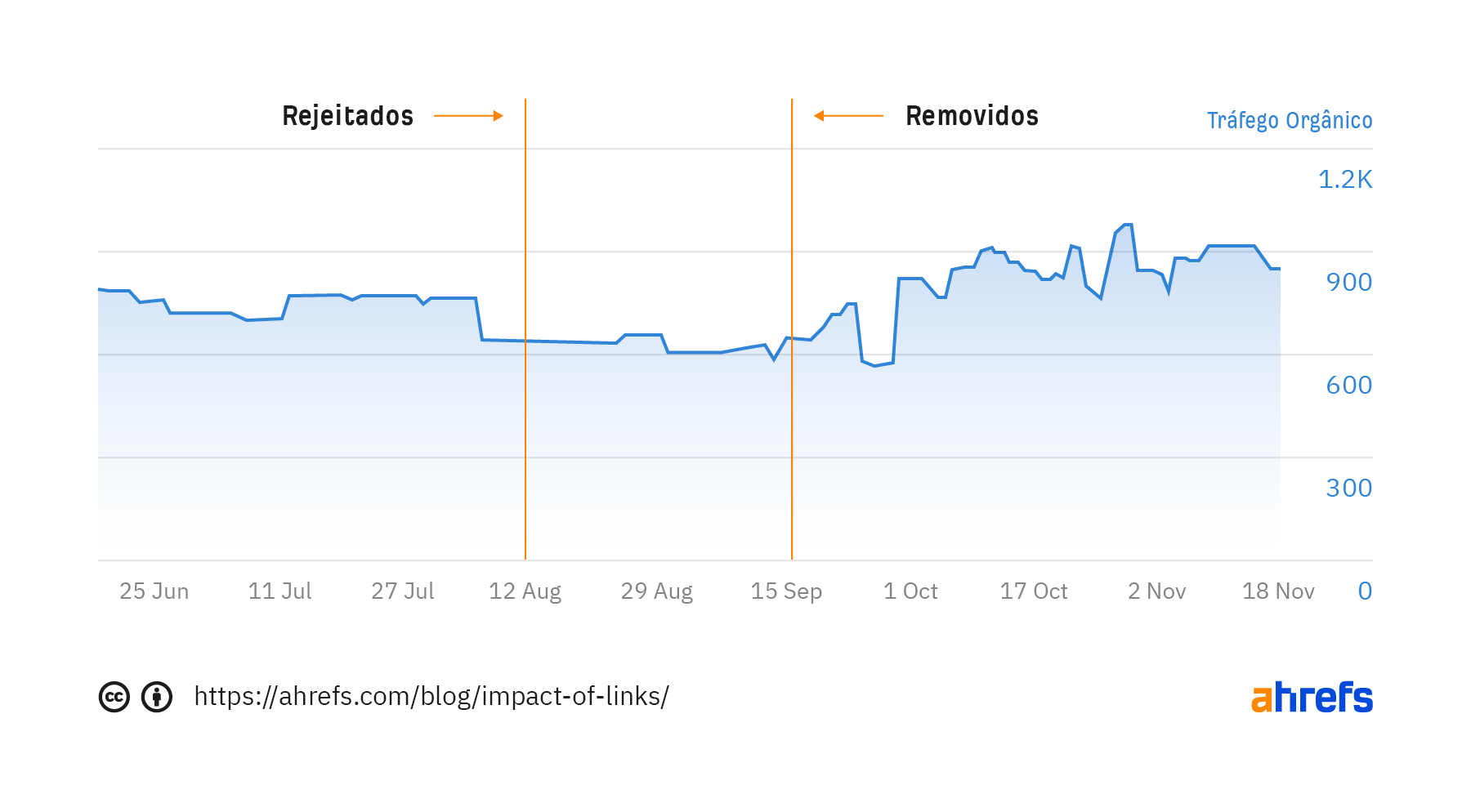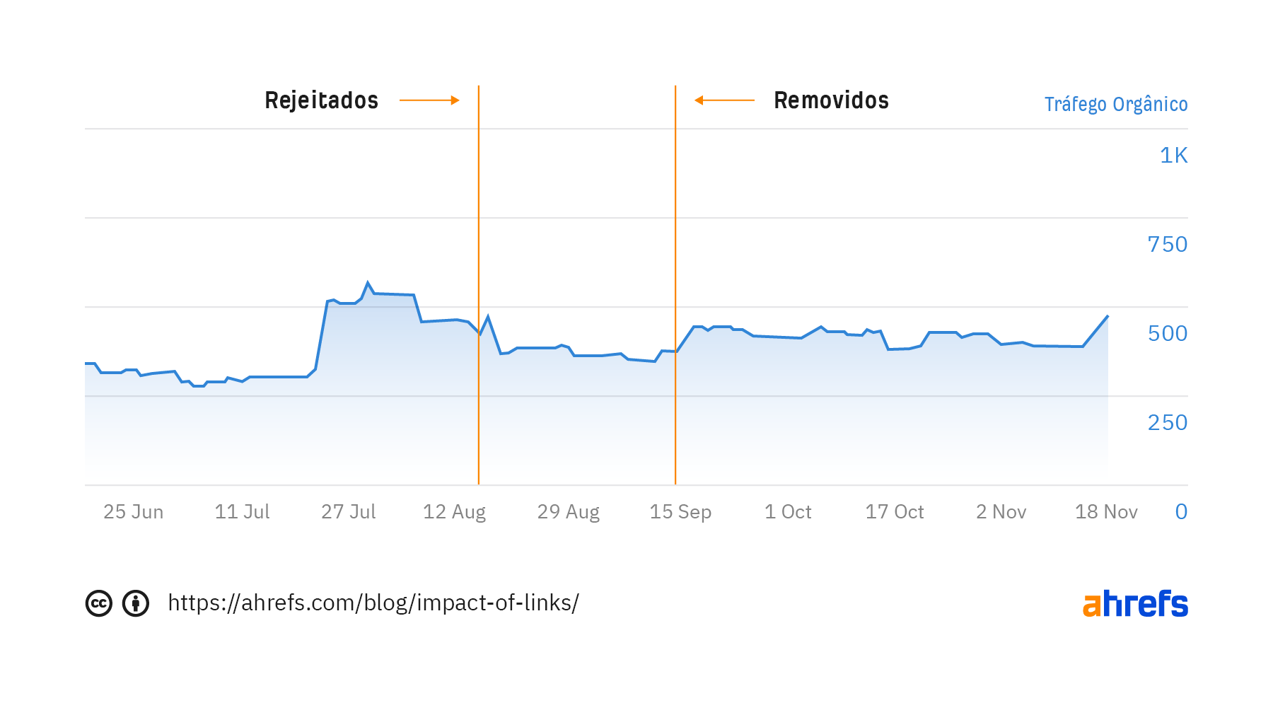 Observe a queda imediata no tráfego quando carreguei o arquivo de rejeição a 17 de agosto. A tendência de queda continuou por um tempo à medida que mais páginas com links para esses mesmos blogs eram analisadas. Em paralelo, também pude verificar o aumento imediato quando removi o arquivo de rejeição no dia 14 de setembro. Suspeito que esse impacto imediato seja porque os links “mais valiosos”, isto é, com maior autoridade, estão em páginas que provavelmente têm maior PageRank e são rastreados mais frequentemente.