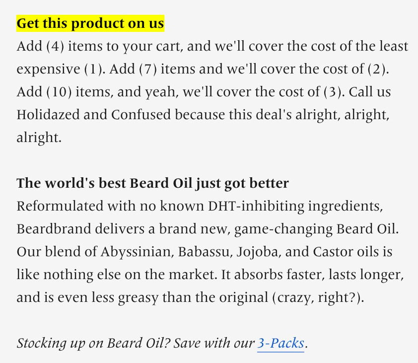 Por exemplo, a Beardbrand oferece aos clientes a opção de comprar um pacote de três óleos para barba (com um desconto adicional como incentivo):