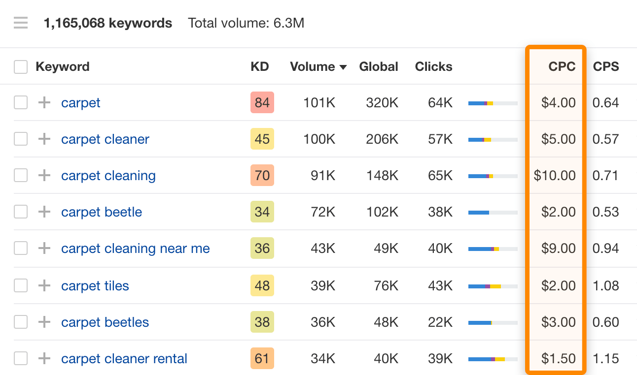 Custo Por Clique varia consoante a palavra-chave, mas pode obter um CPC médio no Explorador de Palavras-Chave enquanto faz investigação de palavras-chave: