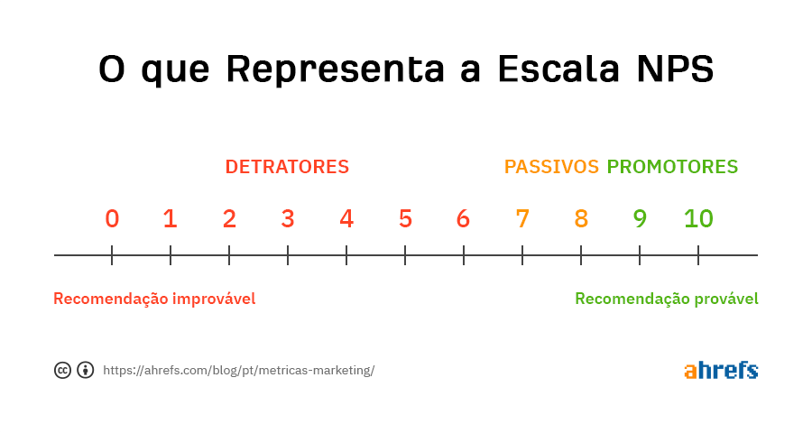 Pontuações variam entre 0 e 10. Alguém que marque entre 0 e 6 é um detrator, entre 7 e 8 são neutros e entre 9 e 10 são promotores.