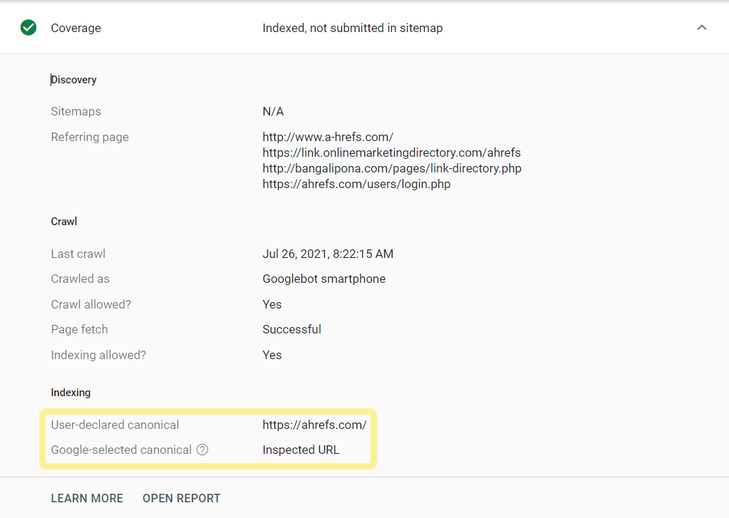 O Google Search Console tem muitos dados para ajudá-lo na migração. Por exemplo, pode verificar se há problemas de canonização usando a ferramenta de inspeção de URL. Basta inserir o URL e o Google dirá qual canónica foi escolhido.