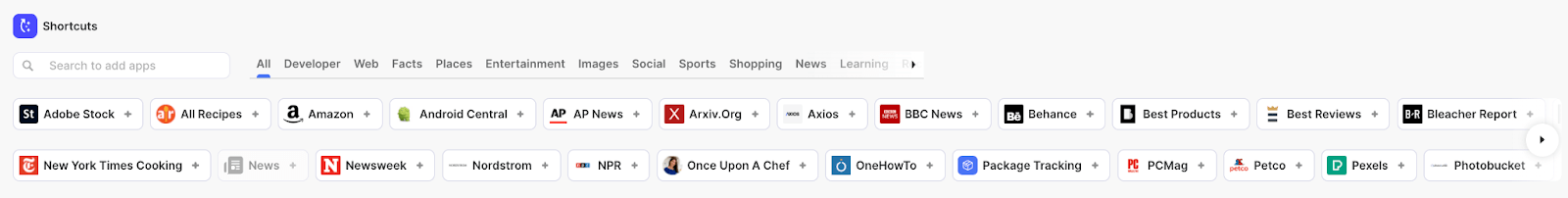 Personalize os seus resultados de pesquisa adicionando aplicativos ao seu feed — há várias categorias para escolher, pois pode adicionar inclusive aplicativos para criador/desenvolvedor, como o Github, ao seu painel.