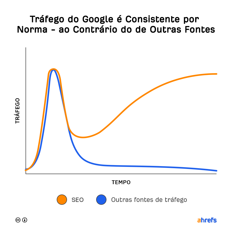 O posicionamento nos motores de pesquisa normalmente leva a tráfego consistente e passivo. Esse raramente é o caso para meios como redes sociais ou email marketing, que geralmente resultam em picos de tráfego que rapidamente se desvanecem para o nada.
