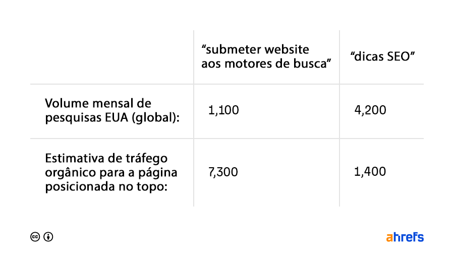Por exemplo, “submeter website num motor de pesquisas” vs. “dicas de SEO”.