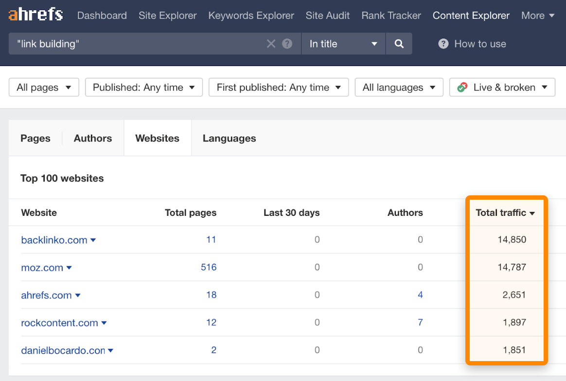 O Explorador de Conteúdos é sem dúvida a forma mais rápida de encontrar oportunidades de ‘arranha-céus’. Basta pesquisar um tópico e filtrar as páginas com muitos domínios de referência (sites de ligações).