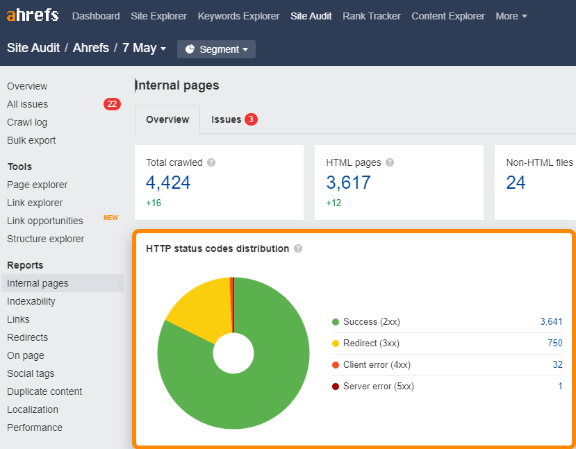 Pode encontrar links corrompidos (4xx) e redirecionados (3xx) no seu website facilmente no relatório de páginas internas na Auditoria de websites.