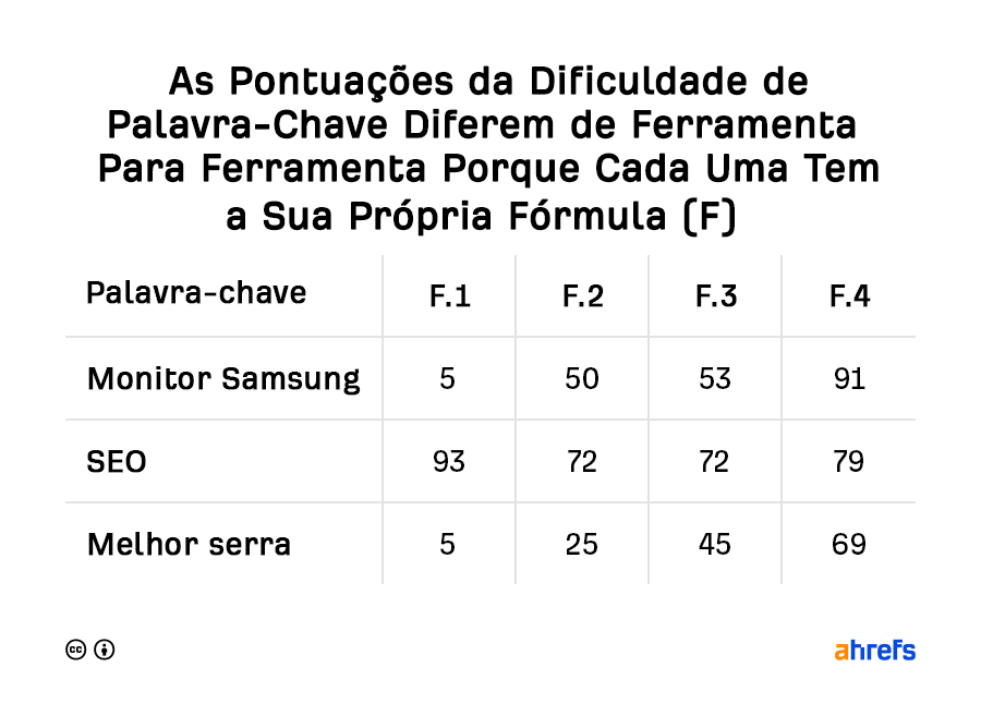Tam­bém é impor­tante perce­ber que cada fer­ra­men­ta de SEO usa uma fór­mu­la úni­ca para a sua clas­si­fi­cação de difi­cul­dade de palavras-chave, o que jus­ti­fi­ca o porquê das clas­si­fi­cações serem muitas vezes bas­tante difer­entes de fer­ra­men­ta para ferramenta.