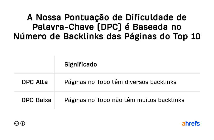 Na Ahrefs, o cál­cu­lo da nos­sa clas­si­fi­cação de difi­cul­dade de palavras-chave (DPC) é sim­ples: peg­amos na média pon­der­a­da do número de domínios de refer­ên­cia (web­sites com lig­ações) que apon­tam para as 10 primeiras pági­nas. Isto sig­nifi­ca que as pági­nas de clas­si­fi­cação supe­ri­or para palavras-chaves com DPC alto têm muitos back­links e as pági­nas de clas­si­fi­cação  supe­ri­or para palavras-chaves com DPC baixo têm poucos backlinks.