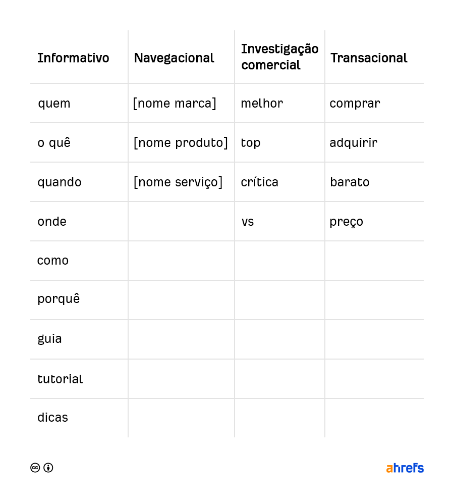 Muitas vezes, pode saber em que tipo a sua palavra-chave se enquadra por mod­i­fi­cadores de palavra-chave uti­liza­dos na con­sul­ta. Se con­tiv­er palavras como “com­prar” or “bara­to”, é provavel­mente uma con­sul­ta transa­cional. Se con­tiv­er palavras como “como”, “o que” ou “onde”, então é provavel­mente informativo.