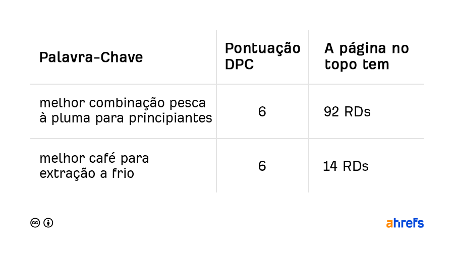, tudo o resto sendo igual, provavel­mente seria mais fácil super­ar a pági­na com 92 RDs do que a pági­na com 14 RDs. Por­tan­to, ape­sar de ter as mes­mas pon­tu­ações de KD, “mel­hor café para bebi­da fria” é indisc­u­tivel­mente uma palavra-chave menos com­pet­i­ti­va do que “mel­hor con­jun­to de pesca com fly para iniciantes”.