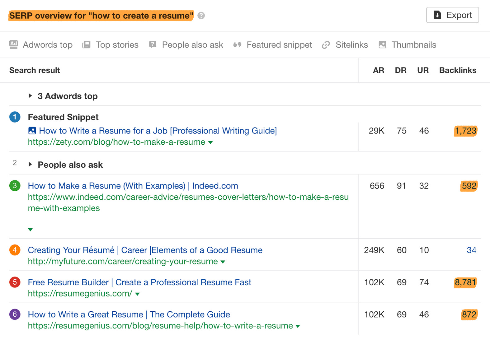 Se ver­i­ficar a visão ger­al do SERP para qual­quer uma destas palavras-chave, dev­erá desco­brir que muitas das pági­nas com mel­hor posição têm muitos backlinks.