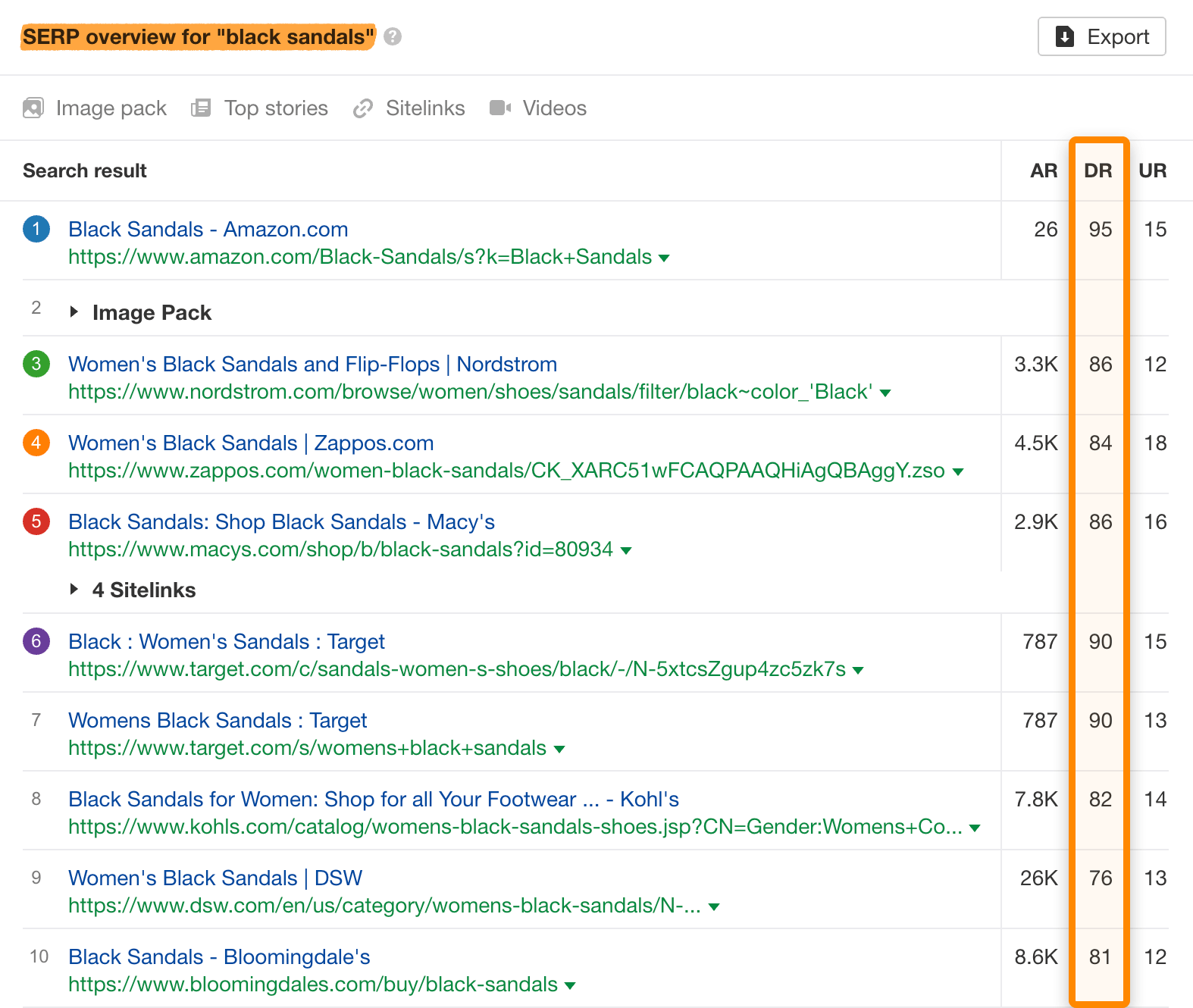 Para a loja Tar­get, “sandálias pre­tas” é uma palavra-chave de baixa com­petição porque tem autori­dade e val­or de mar­ca para se posi­cionar. Se é uma peque­na e famil­iar loja de sap­atos, “sandálias pre­tas” é uma palavra-chave de alta com­petição porque não está na mes­ma liga das grandes mar­cas que dom­i­nam o SERP.