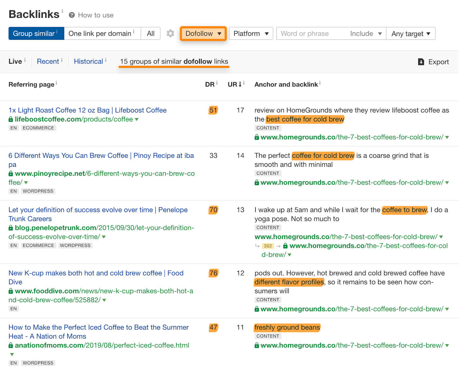 Para a pági­na com 92 RDs, 96% dos back­links são nofol­low, com a maio­r­ia a vir de pági­nas em web­sites de códi­gos de descon­to de baixa autori­dade. Estes tam­bém têm ânco­ras de URL quase nuas.