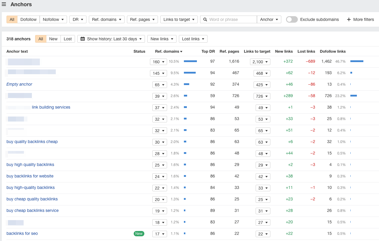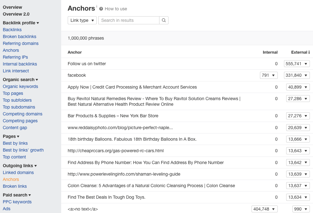 Com um perfil de backlink orgânico, a maioria dos links são ancorados ao nível do URL ou ancorados à marca. Contudo, se um website estiver fortemente envolvido na construção de links manipulativos, você geralmente verá muitas âncoras repletas de palavras-chave de vários domínios de referência: