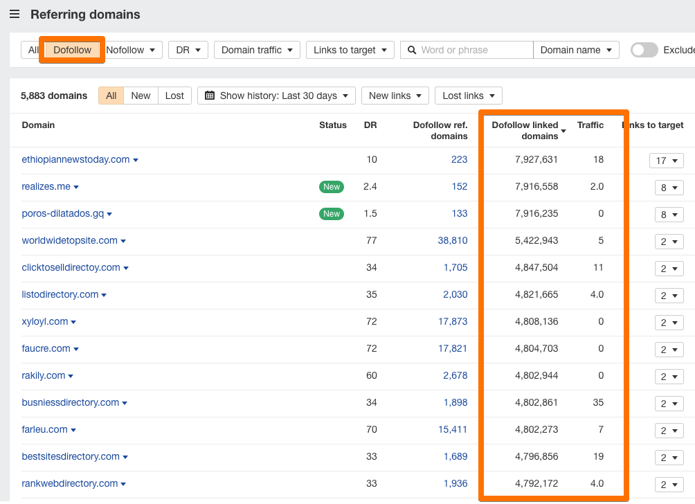 É por isso que adicionamos as colunas “Dofollow linked domains” e “Tráfego” diretamente no relatório de Domínios de Referência.