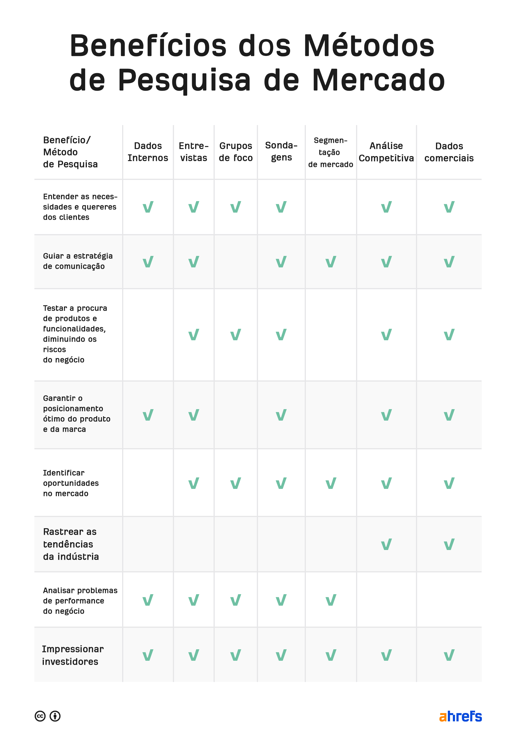 A pesquisa de mercado não é tarefa fácil. Se se sente intimidado por isso, não é o único. Mas não se acanhe. Os benefícios de conduzir pesquisas de mercado, mesmo que esporádicas, podem trazer benefícios para a sua empresa que simplesmente não pode ignorar. Não se tornará um profissional de pesquisa de mercado da noite para o dia, mas a boa notícia é que não precisa. Pode seguir o caminho ágil (como a Ahrefs), usar ferramentas e recursos online de autoatendimento acessíveis ou pode até subcontratar a sua pesquisa. Desde que baseie o seu plano de trabalho de marketing em dados válidos, aumenta drasticamente as suas hipóteses de sucesso.